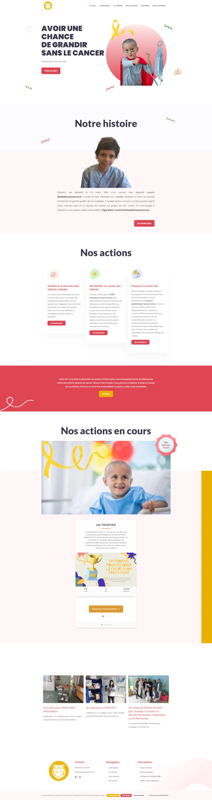 L’Association Tigre Blanc contre le Rhabdomyosarcome, engagée dans la lutte contre cette forme rare de cancer, souhaitait moderniser sa présence en ligne pour mieux informer, sensibiliser et mobiliser le public. Bien que l’association disposait déjà d’un site web, celui-ci ne reflétait pas pleinement l’importance de sa mission ni l’étendue de ses activités. La navigation était peu intuitive, et le design nécessitait une mise à jour pour être plus attrayant et accessible.